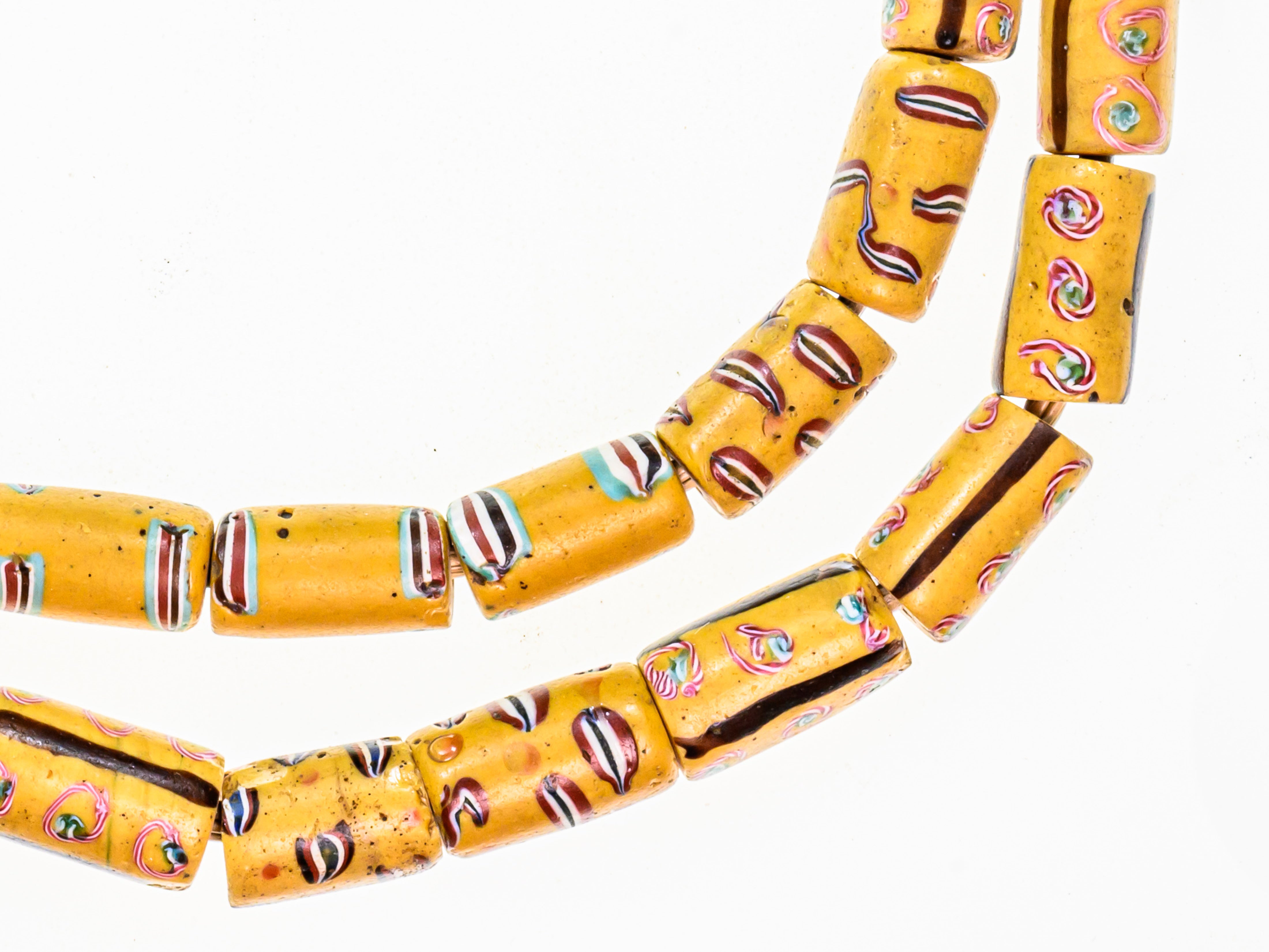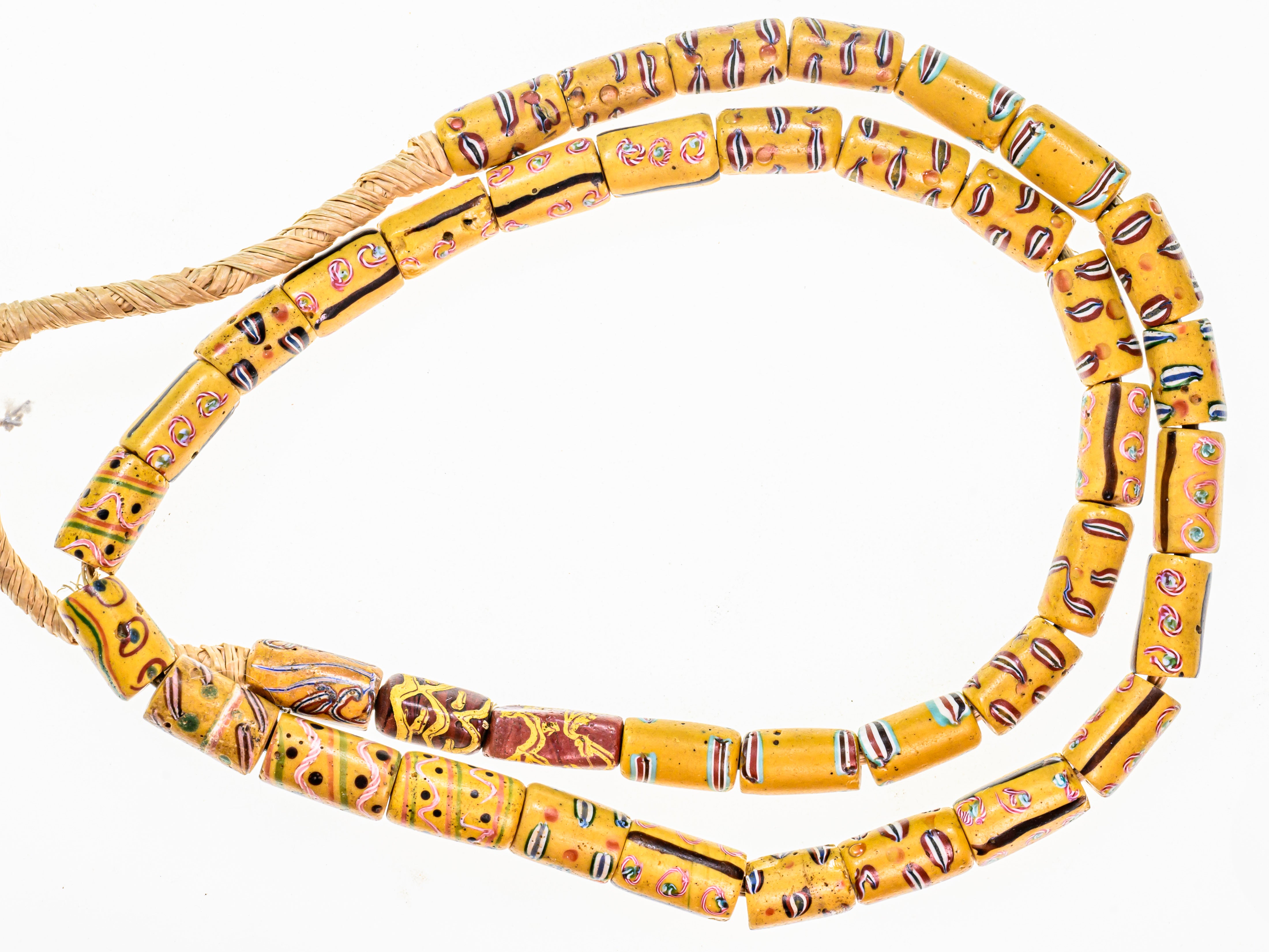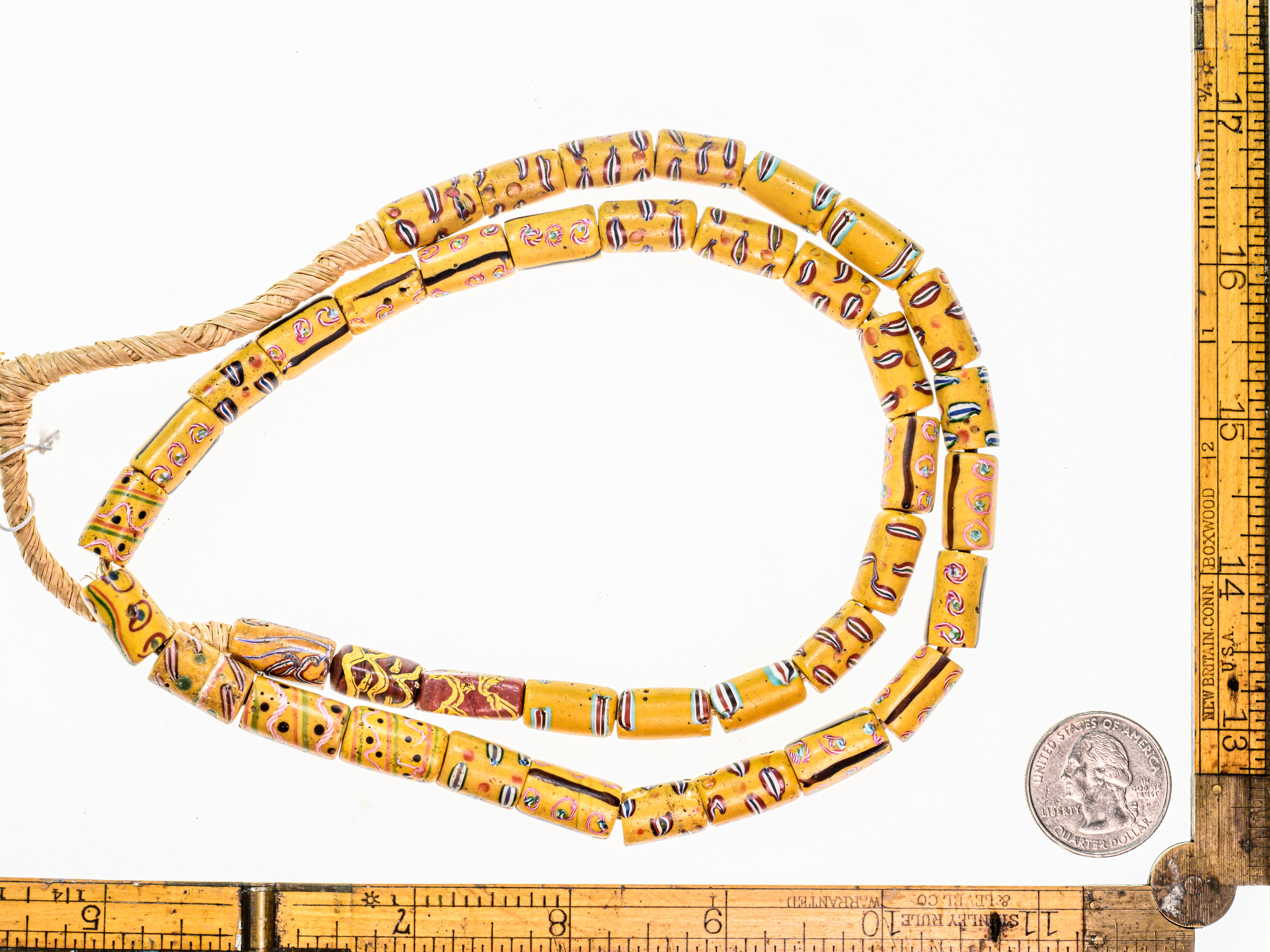 A strand of mustard-yellow African trade milefiori beads dating to the late 1800 - early 1900s. Most beads are cylindrical, a couple of brick -ed beads at one of the ends are rarer, rectangular prism shape.