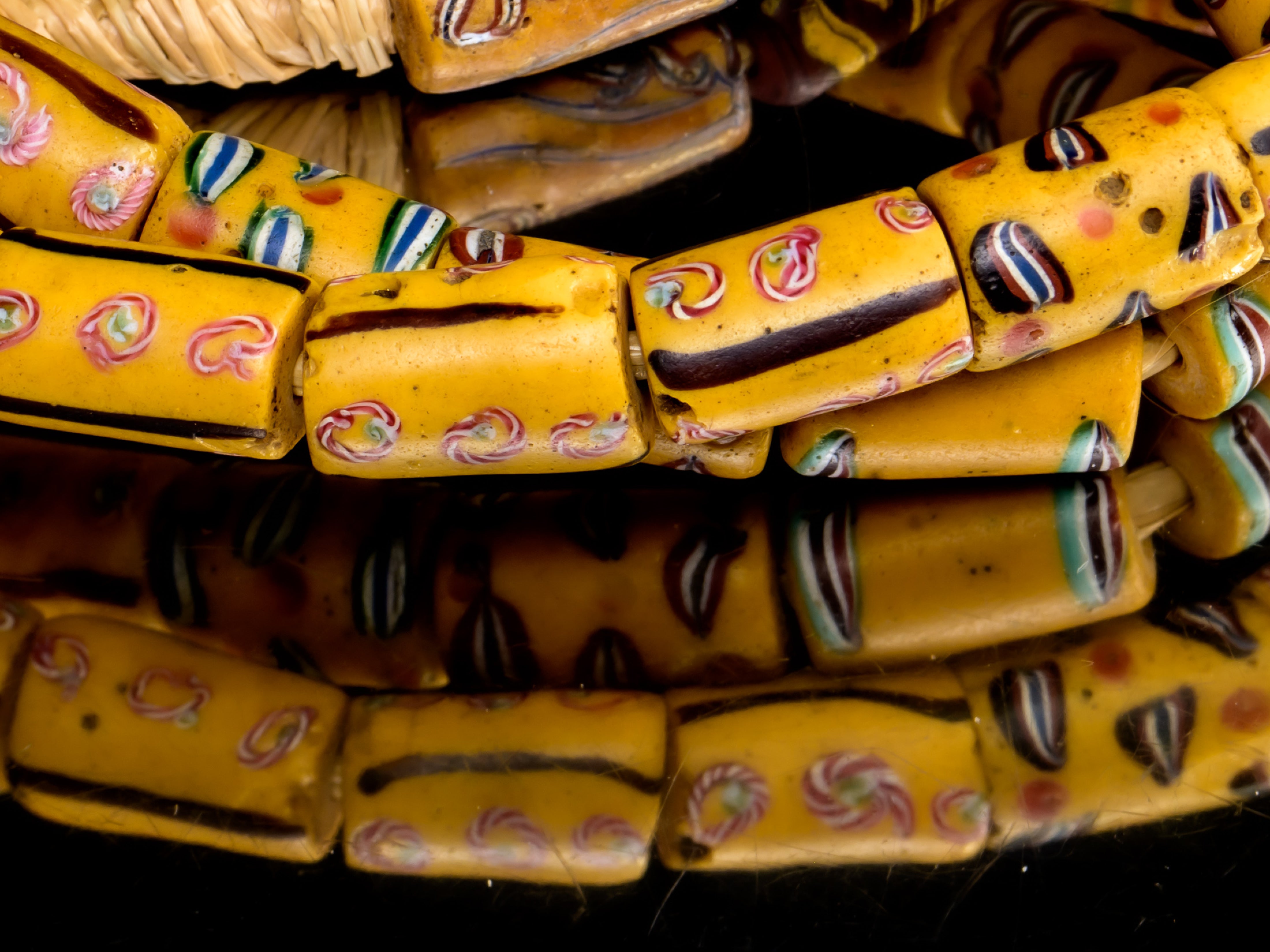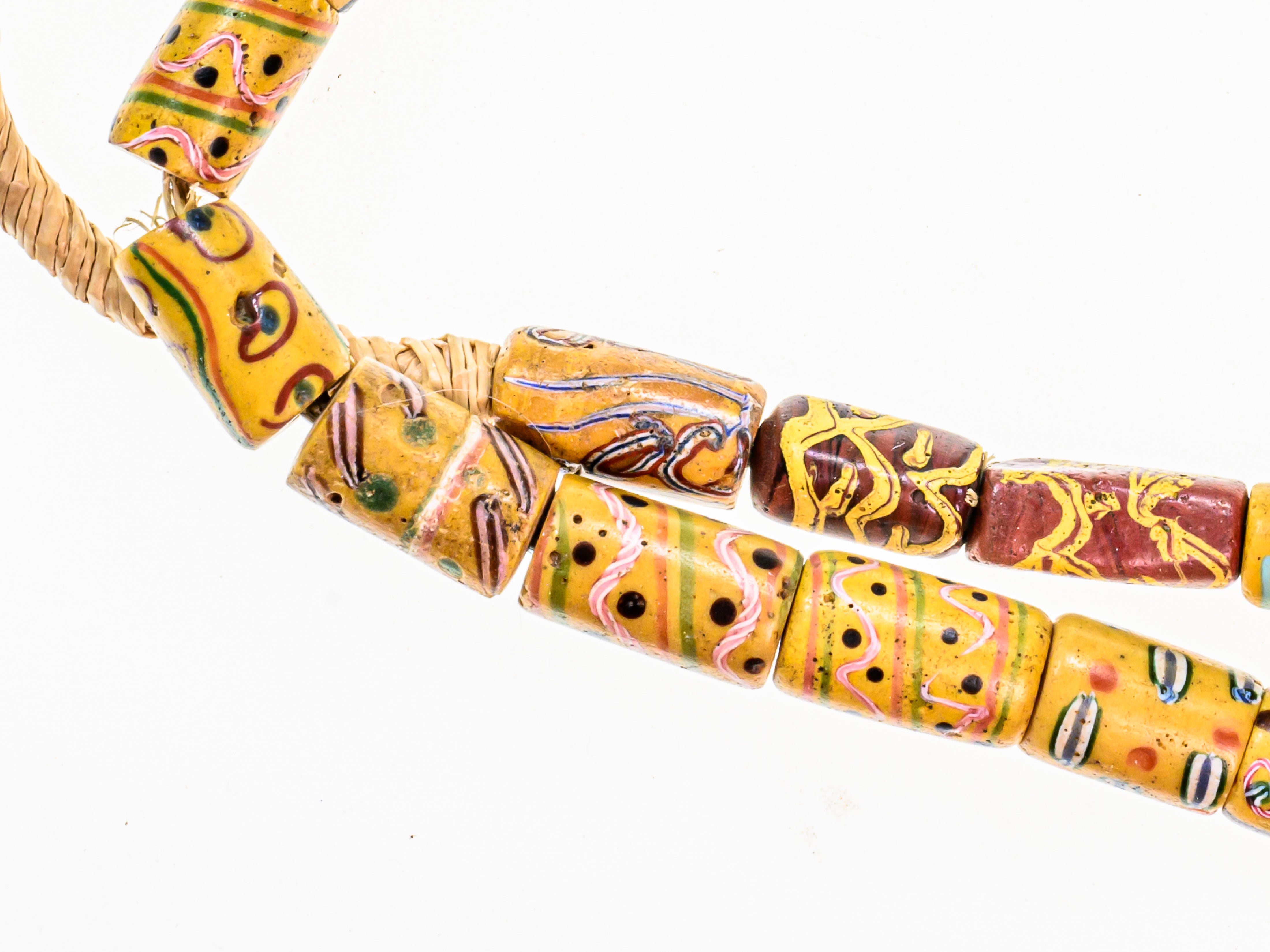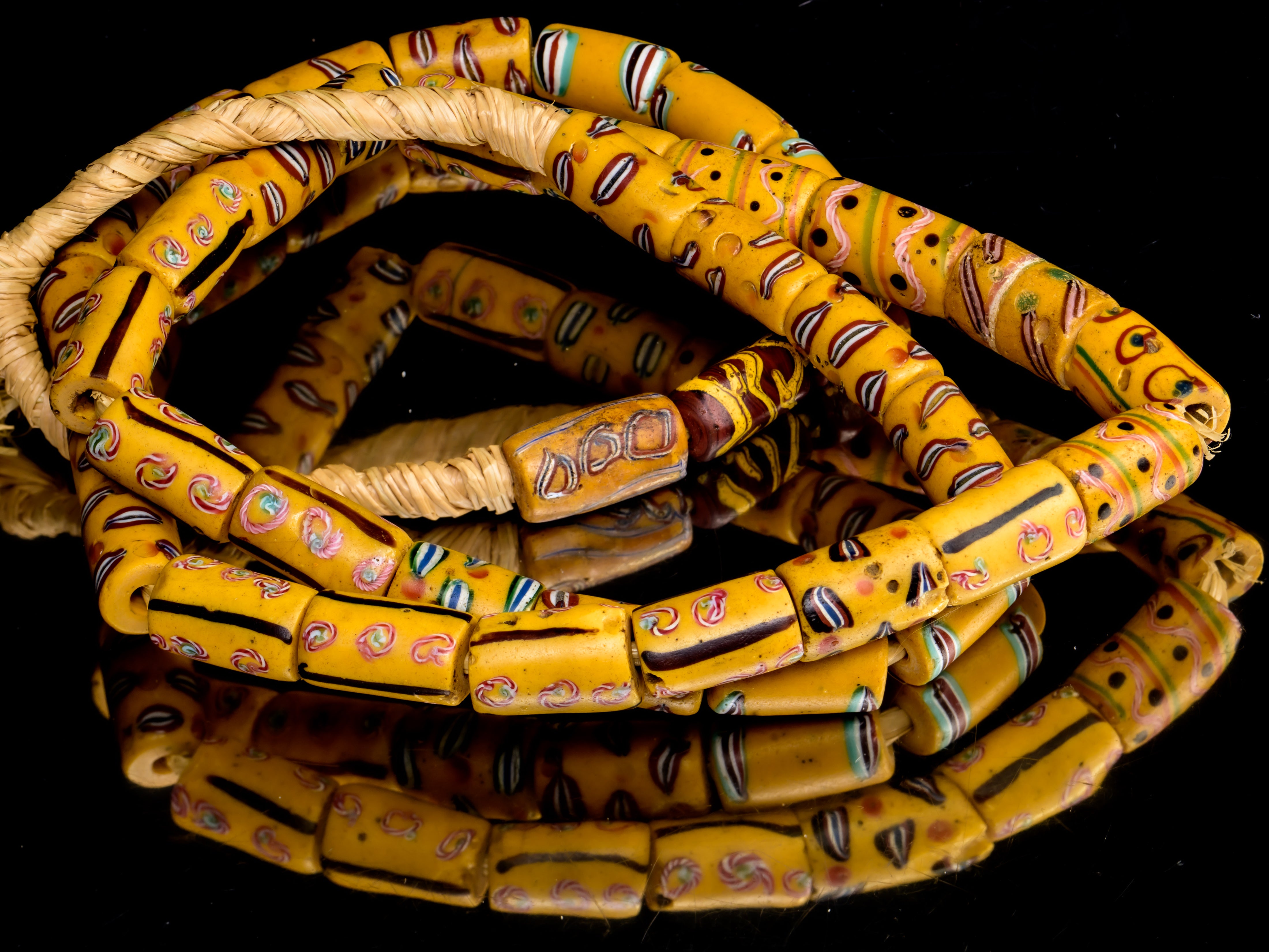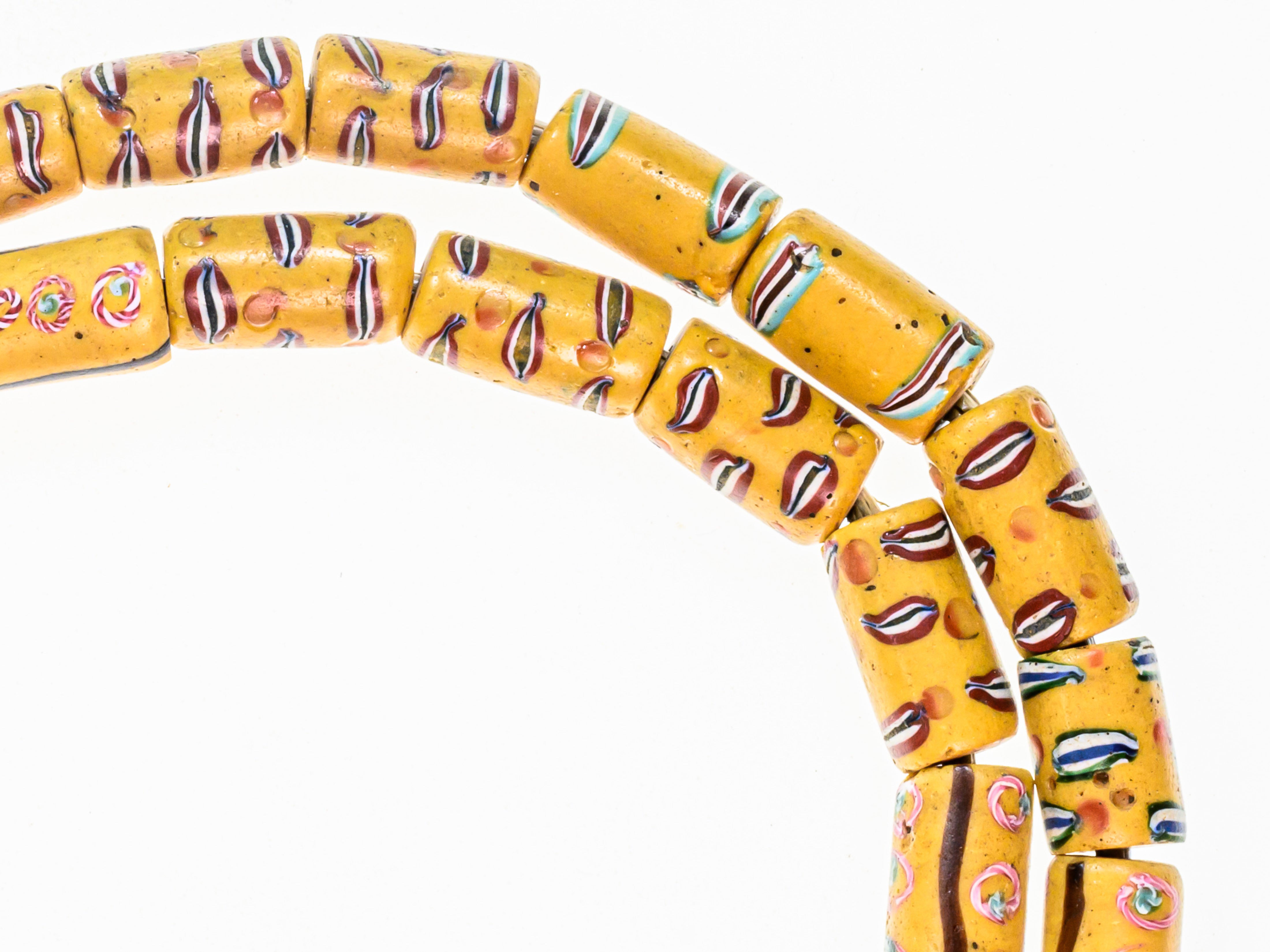 A strand of mustard-yellow African trade milefiori beads dating to the late 1800 - early 1900s. Most beads are cylindrical, a couple of brick -ed beads at one of the ends are rarer, rectangular prism shape.