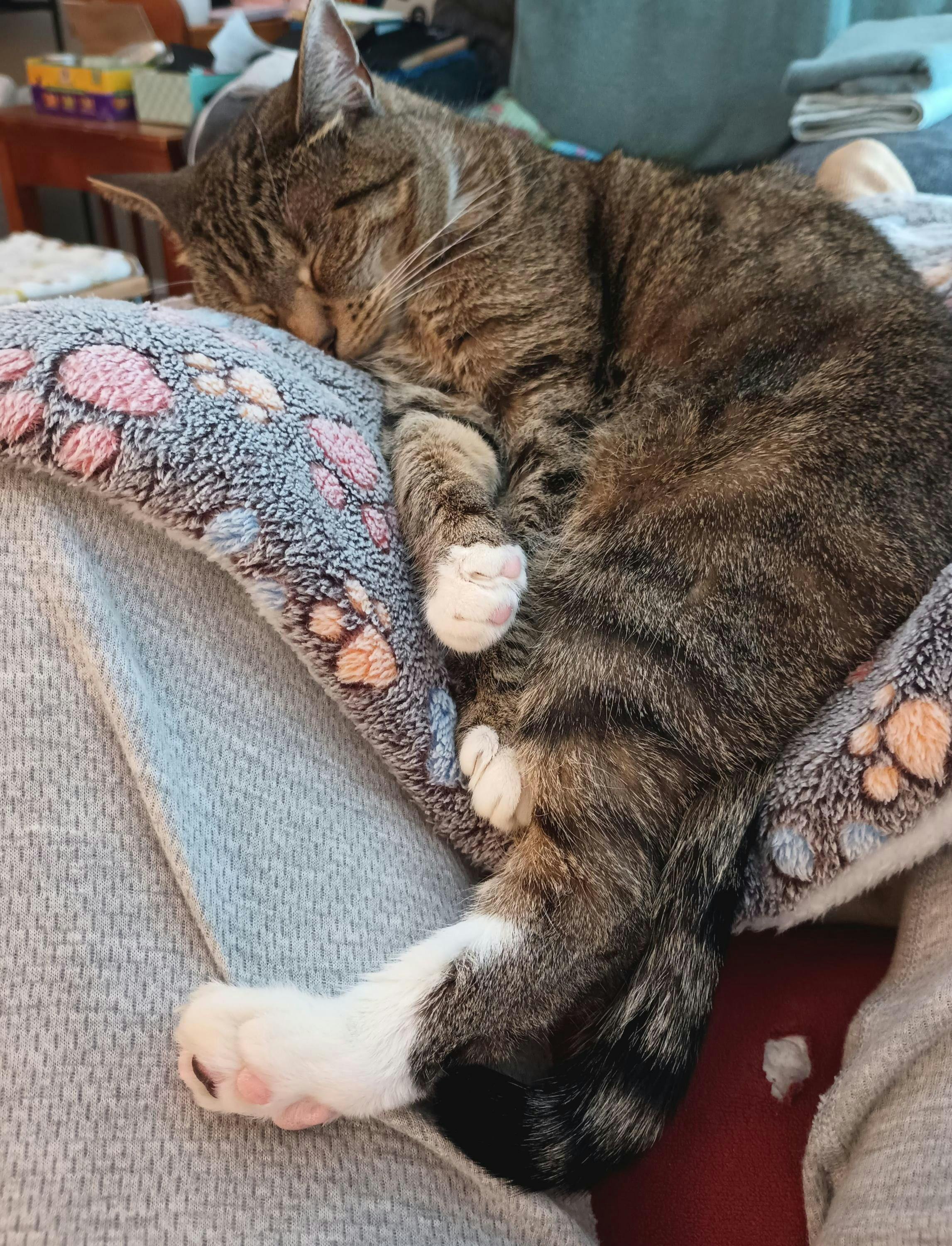 Sharing a picture of my rescue cat who I picked out five-years-ago to be my companion. That was when I could still walk (K-Tape, TENS machine, lidocaine patches, but I could do it).